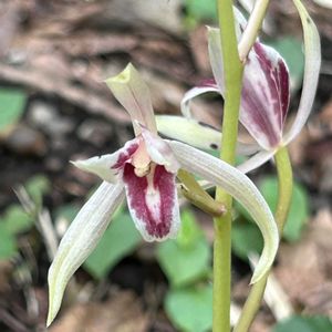 神代植物公園の散策 深大寺に行く途中の小径に咲いてます🤍小さなかぼそいお花です 🤍摩耶蘭(マヤラン)🤍 ラン科シュンラン属 夏と秋の2回咲き 葉が無いので高さ10cm程でちょっと見逃しそうです。 「根も葉もない」と言いますがマヤランは本当に根も葉も無く、普段は地下茎が地面に潜っているだけで、花の時期だけ地上に花茎を伸ばし花を咲かせます。 葉が無いので光合成の能力が無いので栄養分は地下茎の中にいる菌類から得ている、完全菌従属栄養植物です。 これらの菌類は特定の樹木の根としか共生できません 初めましてのお花 ネットで検索