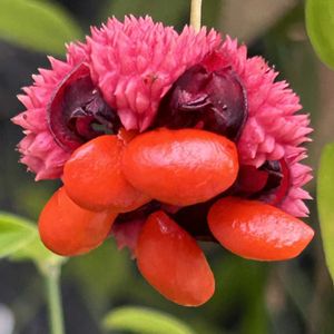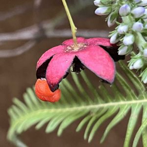 【吊花】《ニシキギ科》 花言葉 「片思い」 ツリバナの実は有毒であり、 人間が食べると 嘔吐や下痢を引き起こし 大量に摂取すると 筋肉麻痺や心臓発作に つながる危険性があります
