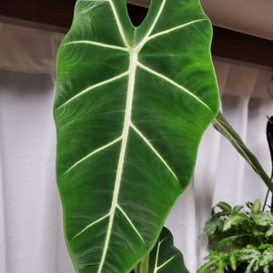 俗によく言う、カーテン越しの明るい日陰🤣🤣 アロカシアの葉っぱがかなりの大きさになってカーテンに当たっております😂 シダたちもワッサワサになってきました〜