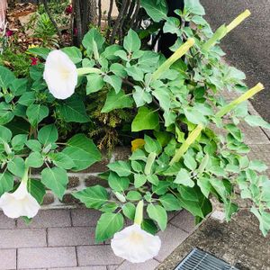 仕事の帰り道にある住宅の一角に咲いていたチョウセンアサガオ、右側の蕾達も明日位には開きそうですね。 (´∀`*)