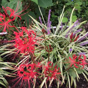 川べりに彼岸花が咲いていました。(*´∇`*) 奥に咲いている紫の花はこれから調べて見ます。(^^;;