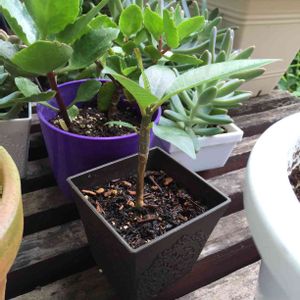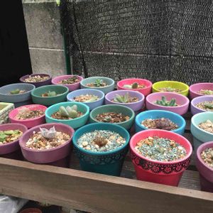 おはようございます♡ 塗り塗りしてそのまんまになってた 植木鉢と 娘の彼氏が作ってくれた植木鉢入れ やっと色々植えました♬ カラフル〜〜❤️💛💚💙💜
