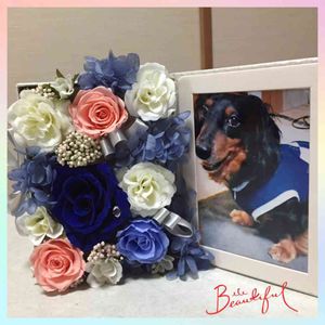 こんばんは〜😊 夜の投稿は久しぶり😁 プリザーブドの課題がやっと出来ました〜💓 アイコンのダックス🐾 一昨年亡くなったけど、一番のお気に入り写真を入れてみました❣️ ♪(´ε` )💕💕 長く飾っておけるから、プリザーブドはいいなぁ〜😘✨✨