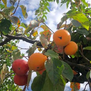 ちょっと留守にしていたら門の前に柿の実がたくさんついた枝が五つ。 きっと隣のお婆ちゃんが置いてくれたもの。種が多いけど、とっても甘い秋の味覚。カラスにも人気で、朝からバサバサしてるから、早目にお裾分けしてくださったんだね。 虫食いや傷もご愛敬💕固いのは冷蔵庫でつめたくして。熟したものはスプーンで掬っていただきます❗️😋