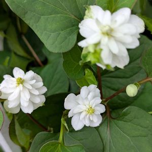 ムベの花 鉢植えでン十年経ち昨年は何度もひっくり返りついに鉢の下から太い根がはびこってしまい、 先日鉢を割り半分以下に切り詰め地植えにしました❤️🩹