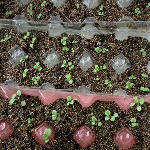 種まき ビオラ 2週間のと1週間目のもの 本葉がチラッと見えるようになりました。 成長ゆっくりです。