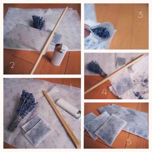 ハイ!今日は簡単香袋作りますね。 1.材料..ドライラベンダー・竹割り箸(割れてないもの)・ライター・不繊紙(ナイロンが挟んであるタイプ←バックや財布などを買った時包んでいるちょっと厚手のタイプ) 2.適当な大きさにカットした不繊紙を袋状にして割り箸で端を挟みライターで炙る(ナイロンが溶けてくっつきます) 3.ラベンダーは細かくカット、茎も刻んで入れちゃいます。 4.適量入れたら口も閉じます。 5.完成 薄くなるのでお財布に入れます。お財布開けるたびにラベンダーが香りますよ〜♪ 本の栞代わりに挟むと本に香が移ってめくるたびに癒されます^ ^ 因みにこれは去年のラベンダー。古くなっても香は健在!捨てずに活用してます。