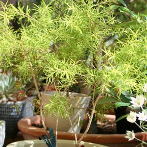 ティーツリー フトモモ科コバノブラシ属の常緑植物 (左側は6/21撮影) スノーインサマーともいう。初夏に白い綿帽子のような花が咲く。 葉は、細長くて、比較的暑さだけてなく、寒さにも強い。 🏷️8日は葉っぱの発表会に参加させてください。