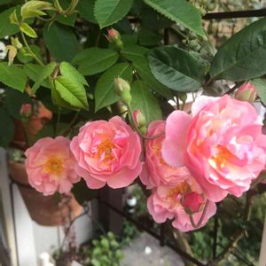 四季咲きつるバラのコーネリアさんが咲き出しました💗 ほんのりアプリコットが入ったピンクが可愛い子😚💞 今年は久々に植え替えたので可愛い赤味を帯びた蕾もいっぱい〜🎶😚