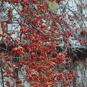 孫とお散歩 湖畔のボート小屋の裏に、見事なツルウメモドキを発見👀 東京では高値で販売されると聞いたので、場所は…しーっ🤫