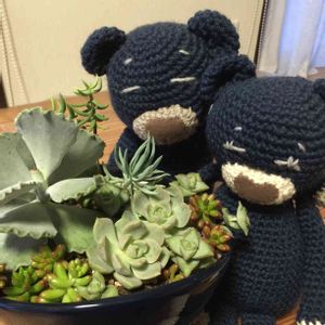 おはようございます😊 こちらも、昨日作った寄せ植え。 大きめ銀波錦を入れて。 冬場に編んだ「くまさんご夫妻」と📸 「寄せたわね❤️」 「寄せたんだな💙」 この時季 編みぐるみ、、暑〜😅💦💦
