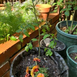 トマト×マリーゴールドの混植は相性がいいというので 植えてみた。 マリーゴールドにセンチュウ抑制や害虫の忌避効果があるとのこと。