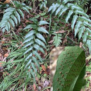 オニヤブソテツ🌿 オシダ科ヤブソテツ属 長さ:15~60センチ 葉は平坦地では立ち上がるが、崖地ではたれさがる。 葉柄基部には褐色の鱗片がある。 葉身は1回羽状複葉で、側羽片は鎌状長楕円形で7~18対あり、厚く、 縁は不規則にうねり、全縁で、先端は尾状にのびる。 色は深緑色である。 胞子嚢群は円形で、裏面全体にちらばる。
