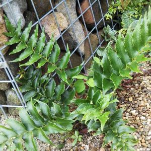 擁壁の水抜き穴から観葉植物🌿 オニヤブソテツ (鬼藪蘇鉄) 別名 オニシダ (鬼羊歯) 葉は平坦地では立ち上がるが、崖地では垂れ下がる。 葉の裏の茶色ブツブツは虫ではなく胞子嚢です。