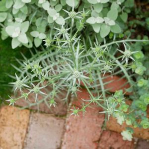 開花のはじまったエリンジューム 葉が固く先が尖っていて 少し触っただけでめっちゃ痛い 中央の花が開き始めで白い小さい花が咲く 葉の色も白っぽくよく見るエリンジュームと比べて かなり地味ではある カラーリーフを好んで買う傾向が強く 特にシルバーリーフが多くて 気付くと緑の葉っぱがない空間ができていたり 形は似ないよう注意して配置するんだけど 寄せ植えに入れてた多年草や宿根草を庭に下ろし 結果的に密集してたりとか 今のところは許容範囲内 枯れる植物が思ったより少なかったのもあり 密度が高く年数が経つと淘汰で減るだろう 暑さ寒さに強い種類が増えたのか 庭を通る強風のおかげか