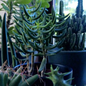 クラッスラテトラゴナの葉がくるんと下に丸まります。これは隣の枝が邪魔になっているのでしょうか? 今、土は完全に乾いていますが、葉が萎れた感じはないので水分は足りているのかなと思います。