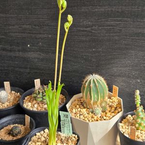 南アフリカの球根植物、所謂ケープバルブの冬型の色々↓ ①エリオスペルマム クーペリ 大きい葉が一枚だけ。冬型だけど夏も休眠せずに常緑で、春と夏に葉が枯れては直ぐに新しい葉を展開するヤル気満々な子。 新しい葉は展開時に日に当てないと思い切り徒長する。鉢が変形する位に球根が大きくなっているので植え替えねば・・。 ②アルブカ ブルースベイエリ 休眠中のちょい水やり2日後に芽が出てきたのは偶然?トリガーになったの?分かりません。これも鉢の中では球根がパンパンになっているので植え替えねば・・。 ③ブルビネ メセンブリアントイデス (メセンブリアンテモイデス) この子は少し芽が出てきてたので、ちょい水やりしたら二つ目の芽も出てきた。 メセンと名が付くが完全に葉が展開するとハオルチアに見える。 以上です。