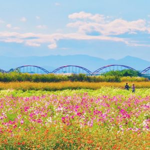 ③ 2ヶ所目 吹上コスモス畑♡ 荒川河川敷に広がる敷地に、ピンクや黄色など色とりどりの約1,000万本のコスモスが咲き誇ります。 近くには赤い水管橋が架かっていて、その長さは約1,100mと日本一 ❣️ 青空を見上げて気持ちが良かった〜♡ 沢山、散策したので、たっぷり満喫出来ました😆 10月21日📷撮影♡