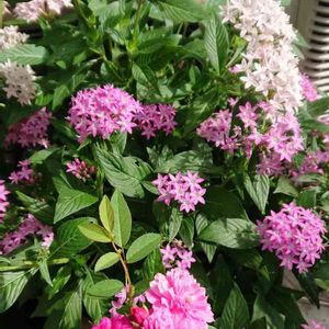 ペンタスパープルスターと 白く見えるけど少し薄いピンク色のペンタス 寄せ植えがワサワサに☆★😊💕 手前の🌹は、香りのバラ スィートシャリオットです💖 色が似ているので植木鉢の薔薇なのでペンタスの前に置いて📲 写真撮ってみました🌹🌿とペンタス☆★可愛い✧︎*