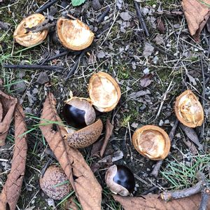 春、綺麗な花を見せてくれたトチノキに実が成り、樹の根元に沢山落ちていました。厚い皮に包まれていますが、落下した時に割れて中身が見えている物も…… トチノミはとてもアクが強いので食べられる様にするには、何日も手間がかかるそうです。 味見ができなくて残念😆