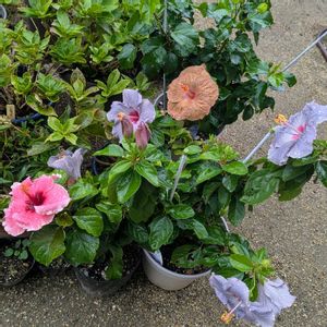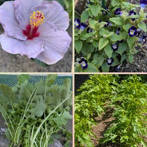 今朝の様子です😊 ハイビスカス トレニア 大根の間引き菜 水菜 野菜が大分成長して来ました 大根の種蒔きは今年のように3〜4粒蒔いたのが良かったと思います😊 蒔き過ぎても間引くのが大変ですから😅