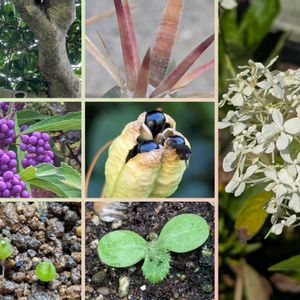 こんにちは😊 今日の庭の様子です🌿 左上より モチノキ サボテンの刺 ノリウツギ ?の発芽 サボテンの発芽 ムラサキシキブ ヒオウギのサヤがはじける瞬間