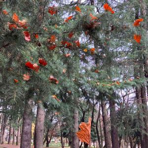 ヒマラヤ杉に引っかかったスズカケの枯葉が クリスマスツリーのオーナメントのよう🌲 シダーローズももうすぐです♪