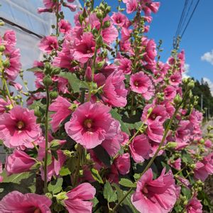 今日のお花🌸✨ タチアオイ💞💞💞💞💞 先月の秋田の農道から🏞️ あちこちに咲き乱れていましたが、こちらのビニールハウスの周りが驚くほど見事な群生集団でした。