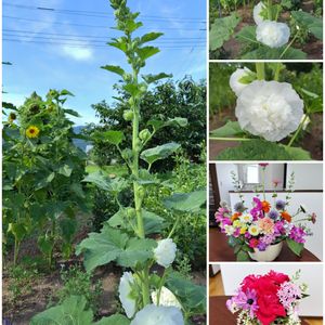こんにちは😊 今日のお花…タチアオイ💓 昨日、はじめて開花してupしましたが、今朝は3個開花していました🙌🎶 真っ白い綿あめみたいな八重のタチアオイです⤴️⤴️ 暑い中、隣りの向日葵🌻と背比べしてるみたい🤭💦 明日から8月…私も頑張らないと…🥵💦