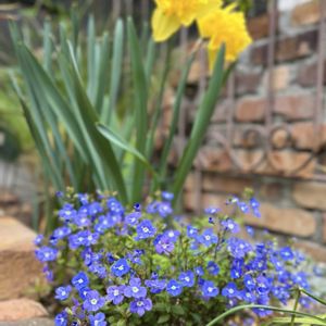 ベロニカオックスフォードブルーもあちこちで咲いてます🥰 ①スイセンの前で💛💙 ②ムスカリと💙💙