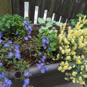 こんばんは 暖かさで(暑さかも)小花がモリモリ咲いています 黄色💛のメカルドニア ゴールドダストももう4年目ですが暑さ寒さにも強く切り戻すと何度も咲いてくれるのが嬉しいです ブルー💙の沢山の花を絨毯のように咲かせるベロニカオックスフォードブルー こちらも4年目です 冬の間も枯れずに葉は赤く紅葉しながら残ります こぼれ種からのリナリアも可愛らしいです