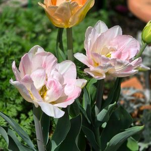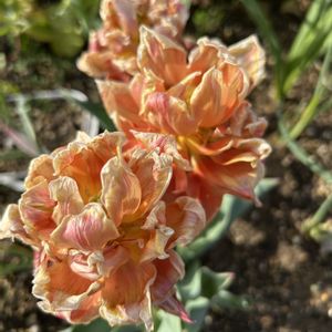 チューリップ ピンク&アプリコット ついにアプリコットカラーも開花しました🤎 いや~可愛い(ノ≧▽≦)ノ 花壇を縁取っているグランドカバーも良い感じに賑わってきました✨