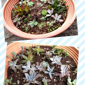 初めて自分で購入した多肉さんも思入れがあるもので。 (上)今年5月にお迎えしたカット苗さんは隙間だらけの寄せ植えに。 (下)今は切り戻したり、席替えをしたり。センペルさんとネックレスさんをお引越しさせた状態です。 やっぱりスッカスカで風通しの良い感じになりました。 名前も育て方もわからないまま。 ただ、「カット苗は切り口を乾かして、発根させてから植える」というところだけきをつけて。 3週間くらい過ぎたのに発根しない子はがいて、シオシオにしおれて、私はオロオロ😅 子持ち蓮華さんは子どもが小さくて…。 「わぁ(●´ω`●)お花さんかわいいねー🌸」 ヨシヨシしていたらしい。そこまでは良かった。 どうやら、ブッチリもぎ取って手のひらに乗せてかわいがり、そっと添え直していたよう。゚(゚´Д`゚)゚。 ジュレって、親株も子株もほぼ壊滅(´༎ຶོρ༎ຶོ`) そんな子持ち蓮華さんは、子株が1つだけ生き延びてくれていて、その子は今も別鉢で大切にしております。 涼しくなって良い色合いになってきました♬💕✨(о´∀`о)🌿✨❤️ BABBIさんの企画に参加いたします(*⁰▿⁰*)ノ