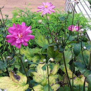 庭の秋明菊 手前が八重咲き、奥は一重咲き あとは今年植えた白花待ちです♡ 紅白で買ったつもりなのに何故か八重咲き❓💦 今年、白花苗🌱買いました😅