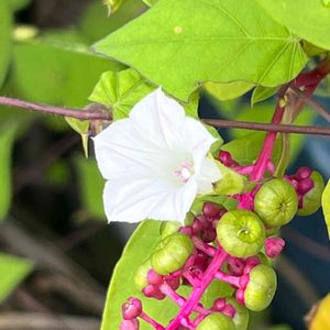 去年種を取ってきたマメアサガオが咲きました⤴️⤴️⤴️ この子小さくて可愛いんですよね💕 植木鉢に勝手に生えてきたヨウシュヤマゴボウに絡んでます💦