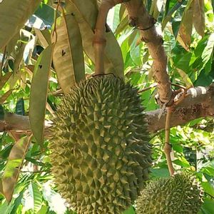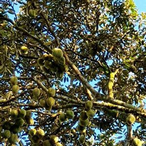 野生のドリアンの木です。高い木にたくさんのドリアンがなっています。熟すとボトっと落ちてきます。