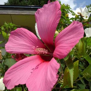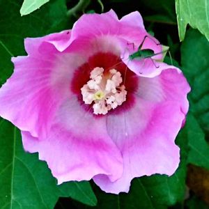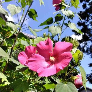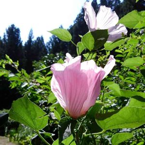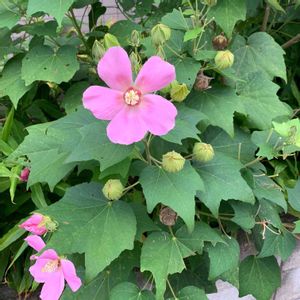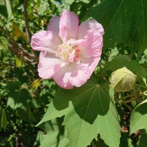 芙蓉(フヨウ) 大きめで夏っぽい💠 まだ続く暑さの中で元気に咲いてます。 昨日のムクゲとは同じフヨウ属 葉っぱが違っていました🔍