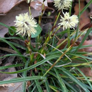 たぶんこれはヒメカンスゲだと思います♪ ヒメカンスゲ(姫寒菅) カヤツリグサ科 スゲ属 多年草 北海道、本州、四国、九州に分布。 山野の林内に生育。 高さ20〜50cm。 葉は革質で硬い。幅2〜6㎜の線形。 小穂はまばらに3〜5個つく。 1番上が雄小穂、棍棒状で太い。 その下に数個つく細い穂が雌小穂。 花期4〜6月 3月31日撮影 郡山市