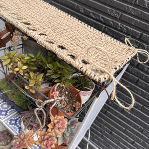 植物棚に屋根を プラは紫外線劣化するから、家にあった梱包用麻紐で編んでみました 麻屋根どうかな?多少日差しからも守ってくれそうだし、風通しは良さそうだから機能してくれるかな、?