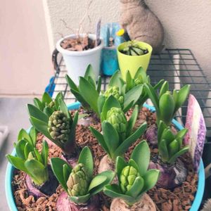 母のお誕生日プレゼントに、ヒヤシンスの鉢植えをプレゼント☺🌼🎁 兄と待ち合わせてお花屋さんで選び、届けてもらいました。早速ベランダに置いて母自身が写真を撮って送ってくれました🥰 奥に写っているのは我が家で冬越ししたリッピア🌿ちゃんと、ムルチコーレちゃん💕☺ 植木鉢が縁しか写っていませんが、とーっても美しいターコイズブルーの鉢なんです✨💖☺️ 母のお誕生日は3月上旬🌸 兄のアイディアで今開花しているものではなく、その頃に満開になりそうなお花に決めました✨✌ 孫娘の意見のブルーの鉢の色もとっても気に入ってくれたそうで、お花好き、園芸好きな母が喜んでくれること、お誕生日当日にもその後もヒヤシンスが母を祝福してくれることを祈っています✨💖🥰☺️