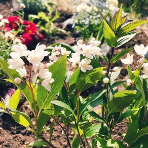 半日陰の花壇 ウツギが可愛く咲いてます 後ろから ギボウシが伸びてきてます もう少ししたら ギボウシが綺麗になります