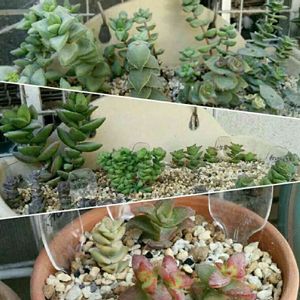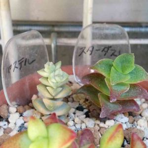 お星さまシリーズ 第1弾✨ クラッスラ大好き😄 スターダストと桜星は、錦玉園に行った時に、苗が無くて サービスで挿し穗を頂きました😄 根付きますように💦 錦玉園の新種サンスターは ラージフォームと似てる👀 でも画像では分かりにくいけど、サンスターは青っぽくて、ラージフォームは緑っぽいの 十字星とパーフォレータも同じかと思いきや…斑の入り方が違う…個体差かもしれないけど💦 奥が深いなぁ… 名前わかりにくくなっちゃったけど 右下パーフォレータヴァリエガータ 下の真ん中は彦星です✨