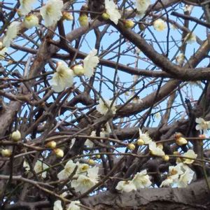 今朝の庭 白梅の木に花がいっぱい咲き出しました🎶 綺麗な梅の実、待ってますね〜🍀