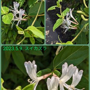 ツツジの生垣に絡まって咲き出した 白色のスイカズラ 横浜市青葉区内 アパート敷地内の花壇にて。 2023年5月9日撮影②