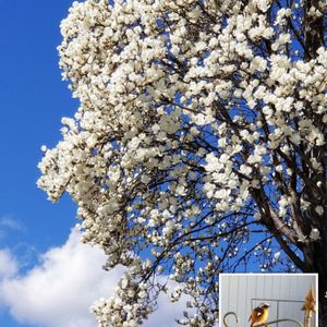 昨日の大荒れのお天気を取り戻すかの様に 青空になった良いお天気です。 お買い物途中でまんかいの木蓮の花が咲いていました。 今日も遊びに来ている ジョウビタキ🐦