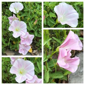 コヒルガオ ヒルガオ科 河川縁、道縁に生える つる性多年草 ハマヒルガオの次に5月末〜6月初めから咲き始める 💐🌸白い縦帯が目立つ 🍃☘️基部は横に張り出し更に2裂する つるは右上がり、他の草に巻き付き少し上る