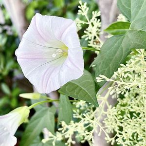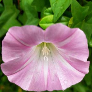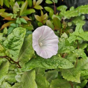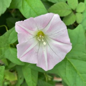 小雨降る夕方の帰り道、植え込みにヒルガオが紛れて咲いていました☺ よく見ると、シベの先端がフックみたいになっています😳