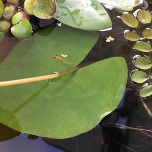 睡蓮の葉の上で遊んでいるパンダメダカちゃん🐟 可愛い😊 私が覗くとみんな集まってきて可愛いです🐟 手ですくえるくらい人懐っこいよ😊