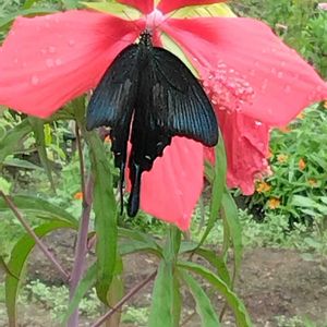おはようございます😊 🏷️今日のお花 タチアオイ れんかちゃん纏ってみました 花に水をかけていたらスズメバチを二匹発見 急いで退散しました😅