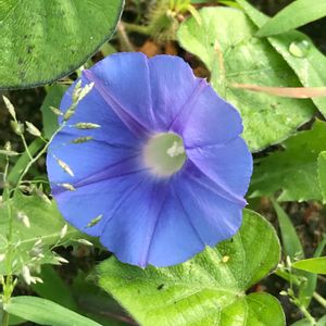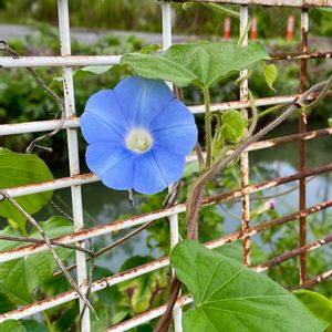 早朝散歩🚶♀️、曇り空で朝陽は拝めませんでしたが、代わりに、こんな爽やかな朝顔が待っていてくれました💙 葉が丸いので、マルバアメリカ朝顔かな、錆びた用水のフェンスに絡み付いて、キョトンと、こっちを見ていました🌿🌿